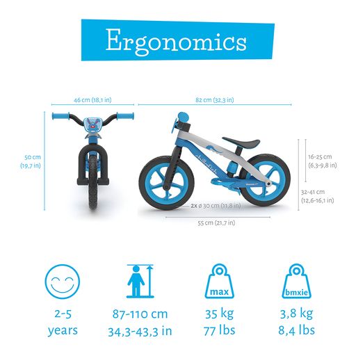 | BMXie2 belki de dünyanın en "cool" denge bisikleti! Entegre edilmiş ayak dinlendirme yeri ve ayak freniyle daha iyi bir sürüş, frenleme ve küçük numaraları öğrenme için de ideal. BMXie2 güçlendirilmiş plastik gövdesiyle hem sağlam hem de hafif (3,6kg) bir tasarıma sahiptir. Kauçuk kaplı üst kalite 12 inç patlamayan, şişirme gerektirmeyen tekerlekler ile güvenli bir sürüş imkanı verir. |