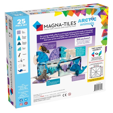 Magna-Tiles® Arctic Animals 25 Parça Set ile buzla kaplı sulara yolculuk yapın. Genç kaşifler, penguenlerin ve kutup ayılarının ayak izlerini doğal yaşam alanlarına kadar takip edebilir, kıyıdaki foklarla rahatlayabilir ve heyecan verici balina saatlerine gidebilir. Çocuklar, birlikte tıklatılan şekilleri kullanarak buzullar, dağlar ve daha soğuk iklimlere özgü hayvanlarla dolu kendi ortamlarını yaratabilirler.