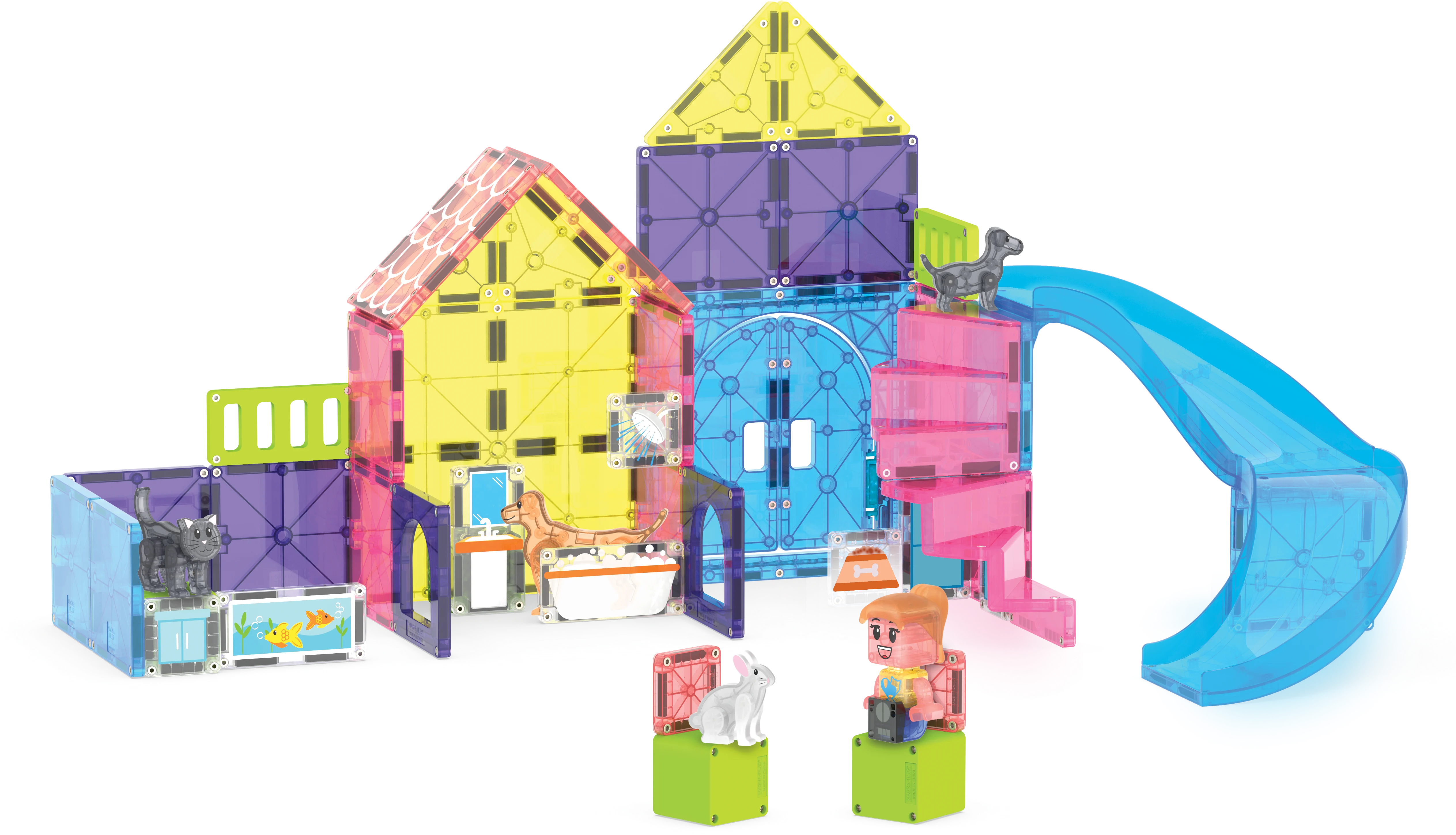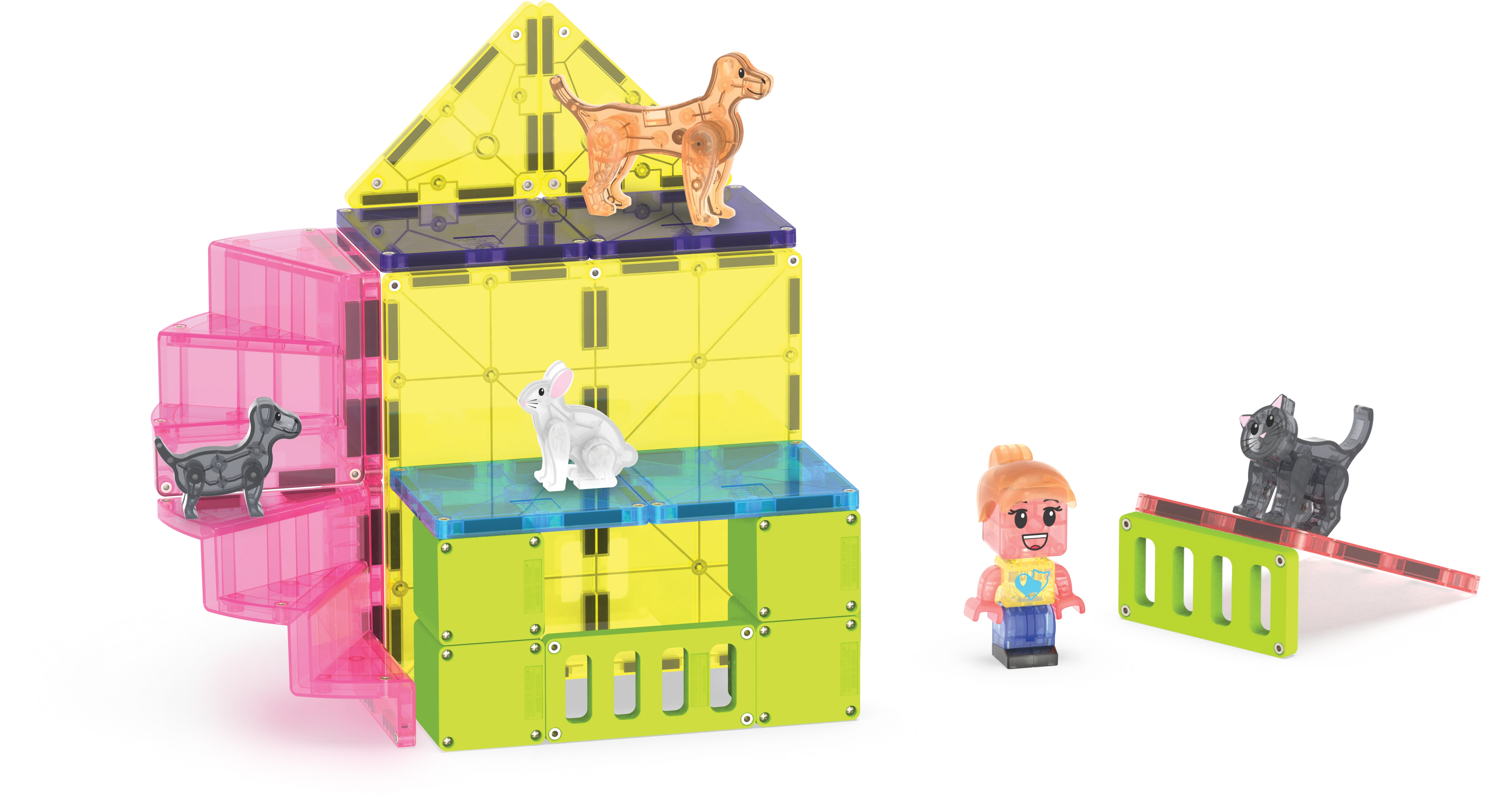 MAGNA-TILES Pet Playhouse ile çocuklar, oyuncu bir köpek yavrusu, meraklı bir kedi, zıplayan bir tavşan ve maceracı köpek arkadaşları için mükemmel bir evcil hayvan dünyası inşa edebilirler. Çift kapıyı açarak evcil hayvanlarınızın mobilyalara tırmanabileceği, yeni S kaydırağından kayabileceği ve sonsuz hayal gücü olasılıklarıyla dolu bir alanı keşfedebileceği bir oyun evine girin!