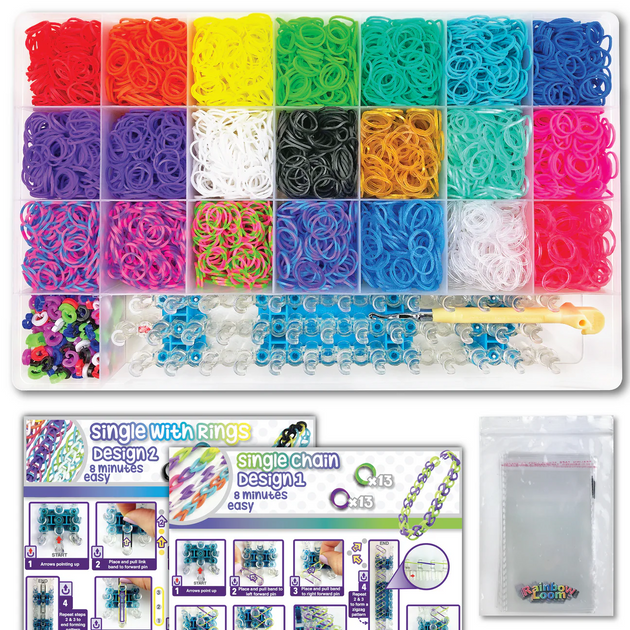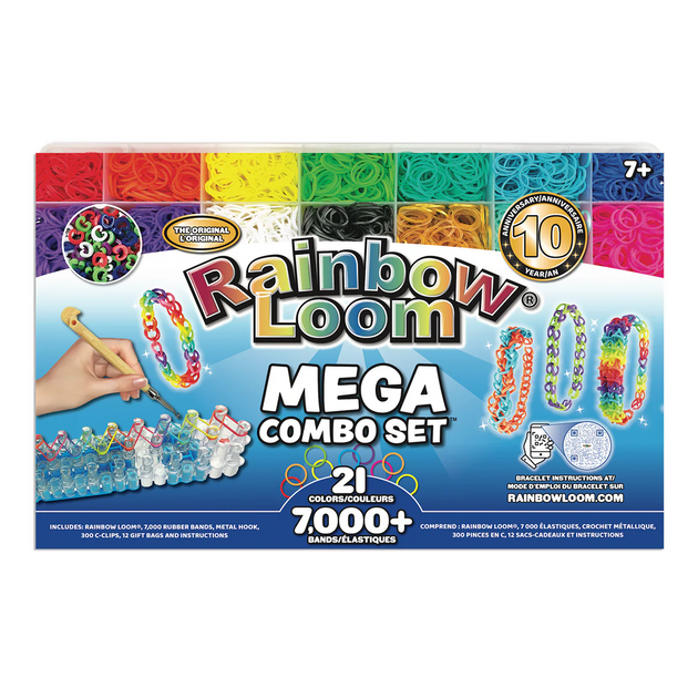 Rainbow Loom Mega Combo Set, 7.000’den fazla lateks içermeyen renkli lastik bant, orijinal Rainbow Loom tezgâhı ve metal kancasıyla uzun süreli bir yaratıcılık deneyimi sunar. 21 farklı renkte bantla bileklik, takı ve çeşitli aksesuarlar tasarlayabilir, setin içeriğindeki hediye çantalarıyla bu tasarımları sevdiklerinize armağan edebilirsiniz.