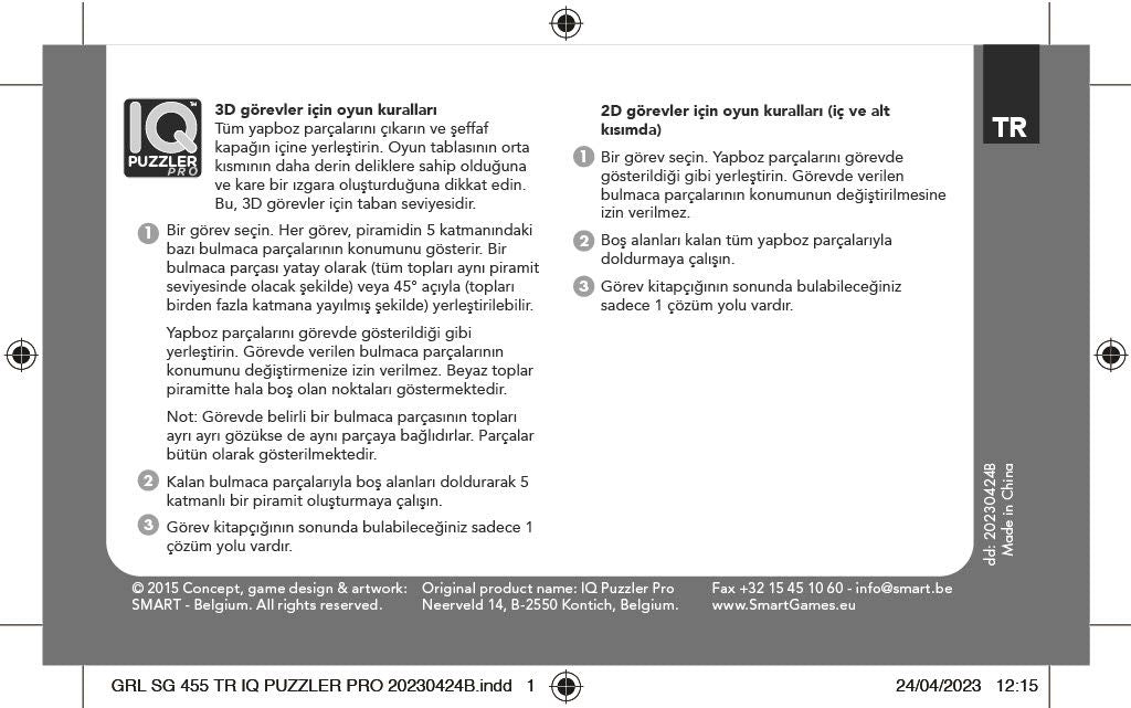 Çoklu seviyelerde zekâ oyunu eğlencesi! SmartGames yeni IQ-Puzzler Pro, hem 2D hem de 3D görevler dahil olmak üzere üç oyun modunda 120 görev içerir! Oyun tahtasının üst kısmında 2D görevler ve 3D piramit görevler için bir ızgara bulunurken, tahtanın alt kısmında tamamen farklı bir 2D görev ızgarası bulunur. Hepsi tek bir kompakt, taşınabilir seyahat kutusunda sunulmaktadır. Konsantrasyon, mantık, planlama, problem çözme ve uzamsal algı gelişimi için… Önerilen yaş: 6+ yaş - Yetişkin |