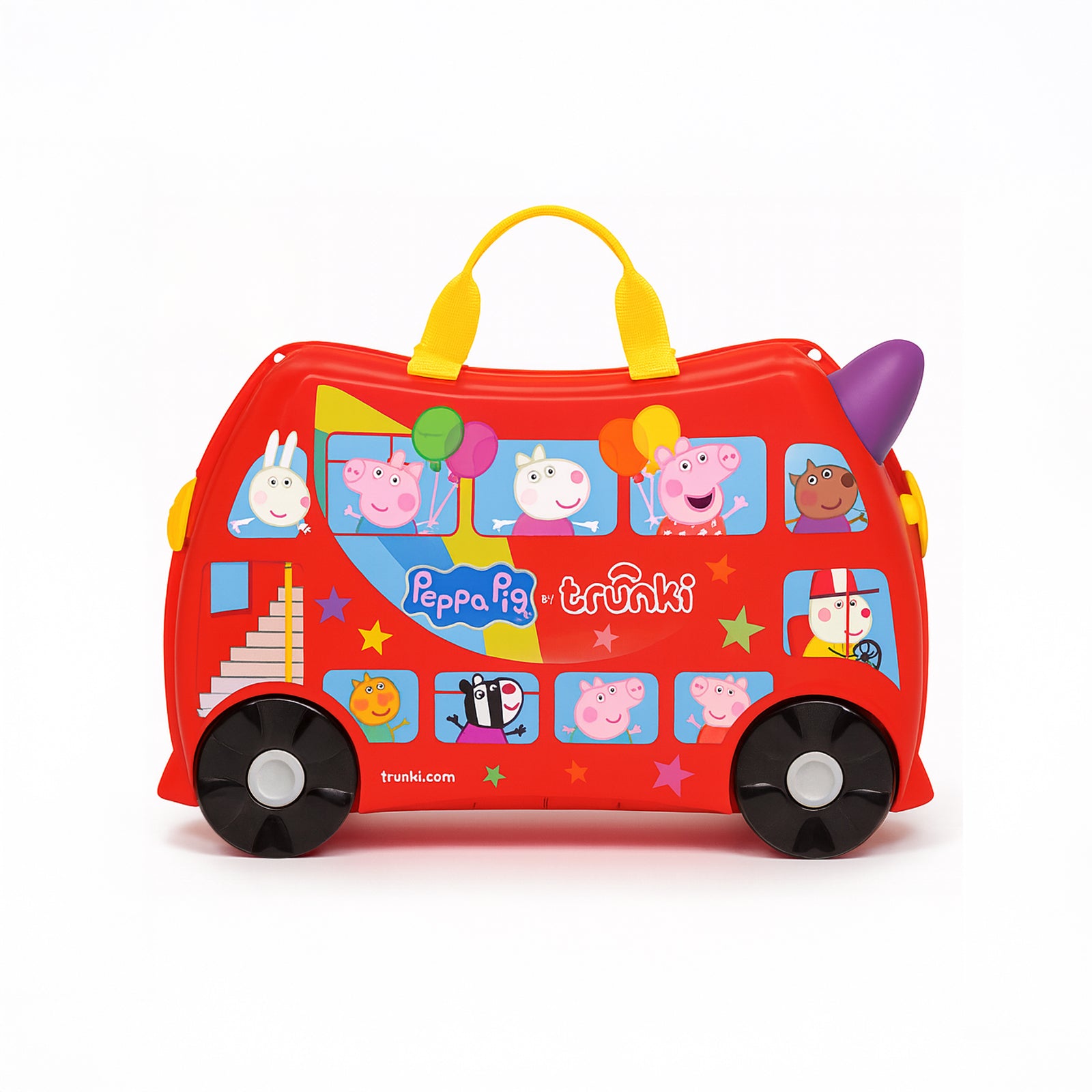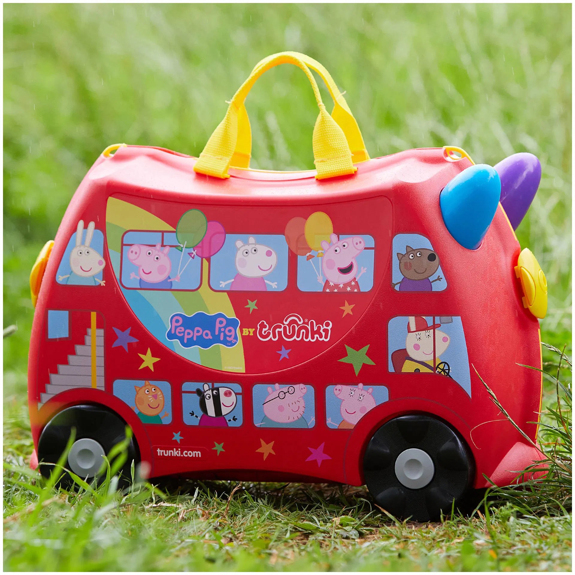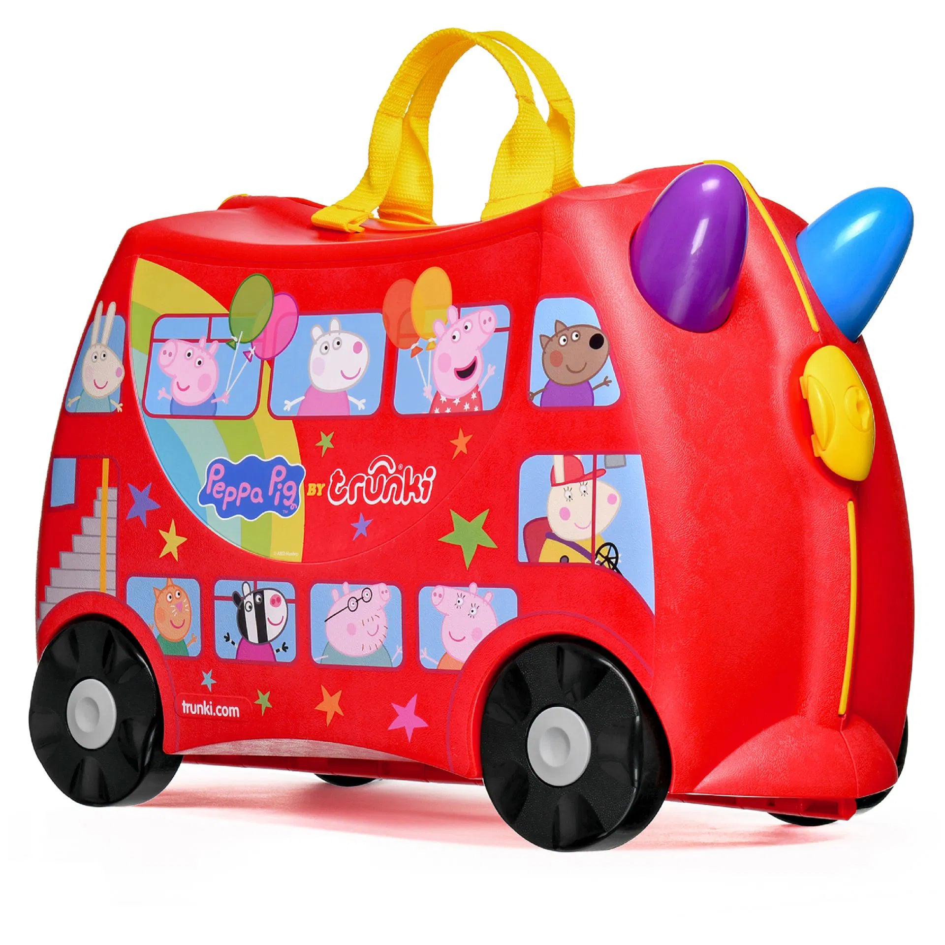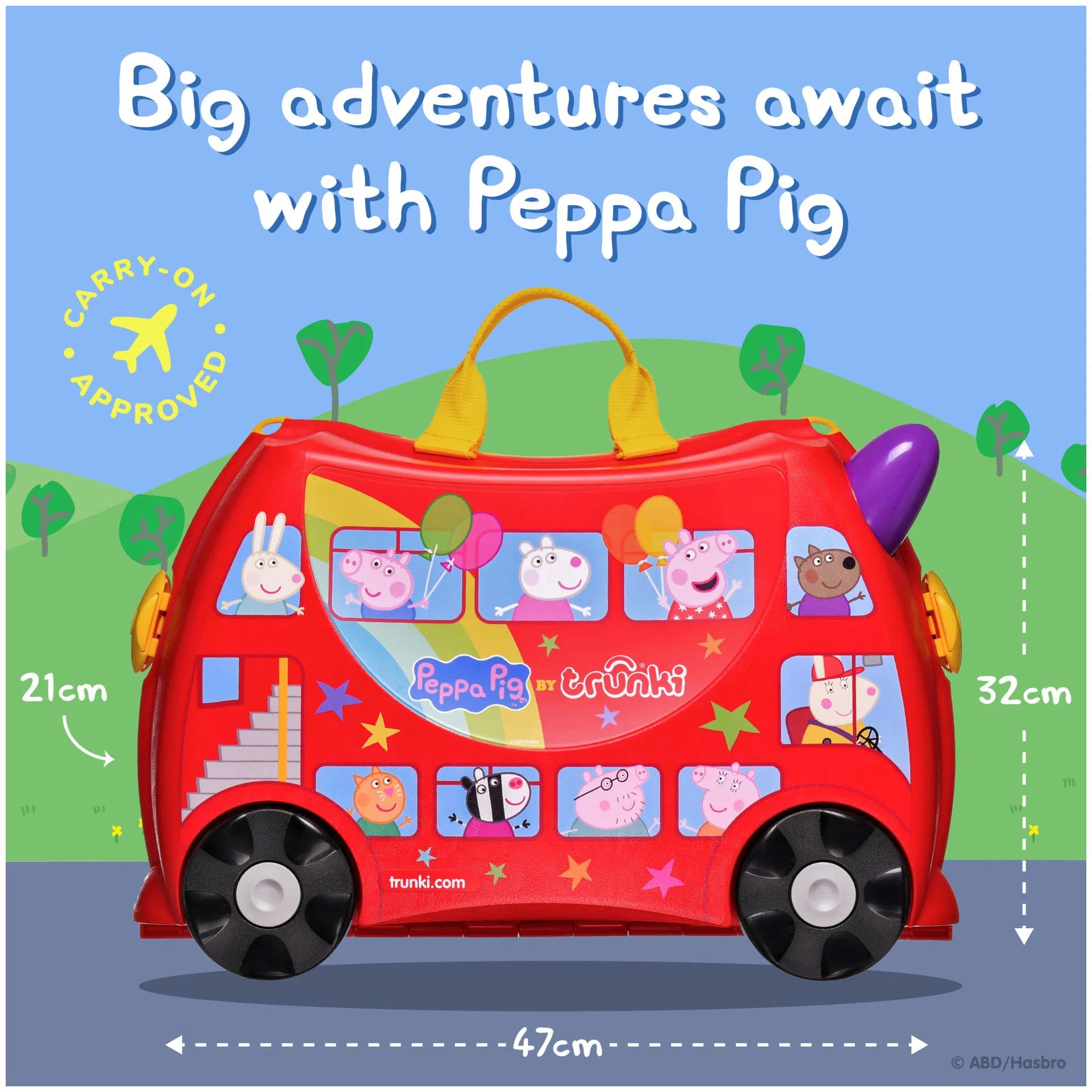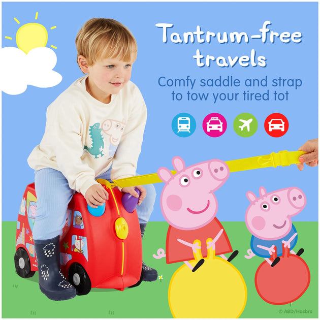 Hem bavul hem de çocukların yeni eğlence kaynağı. Çocuklarla seyahat artık daha kolay ve eğlenceli. Bavul olarak kullanılan Peppa Big Party Bus'ı çocuklar üzerine binerek sürebilir. İçinden çıkan askısı kullanılarak üzerine oturan çocukla birlikte yetişkinler tarafından çekilebilir. İhtiyaç duyulduğunda omuz askısı ile taşınabilir. Bavulun iki tarafında yer alan kilitler bavulun kolay ve sağlam bir şekilde kapanmasını sağlar. 18 litre iç hacmi vardır, boş ağılrlığı 1,7 kg'dır.