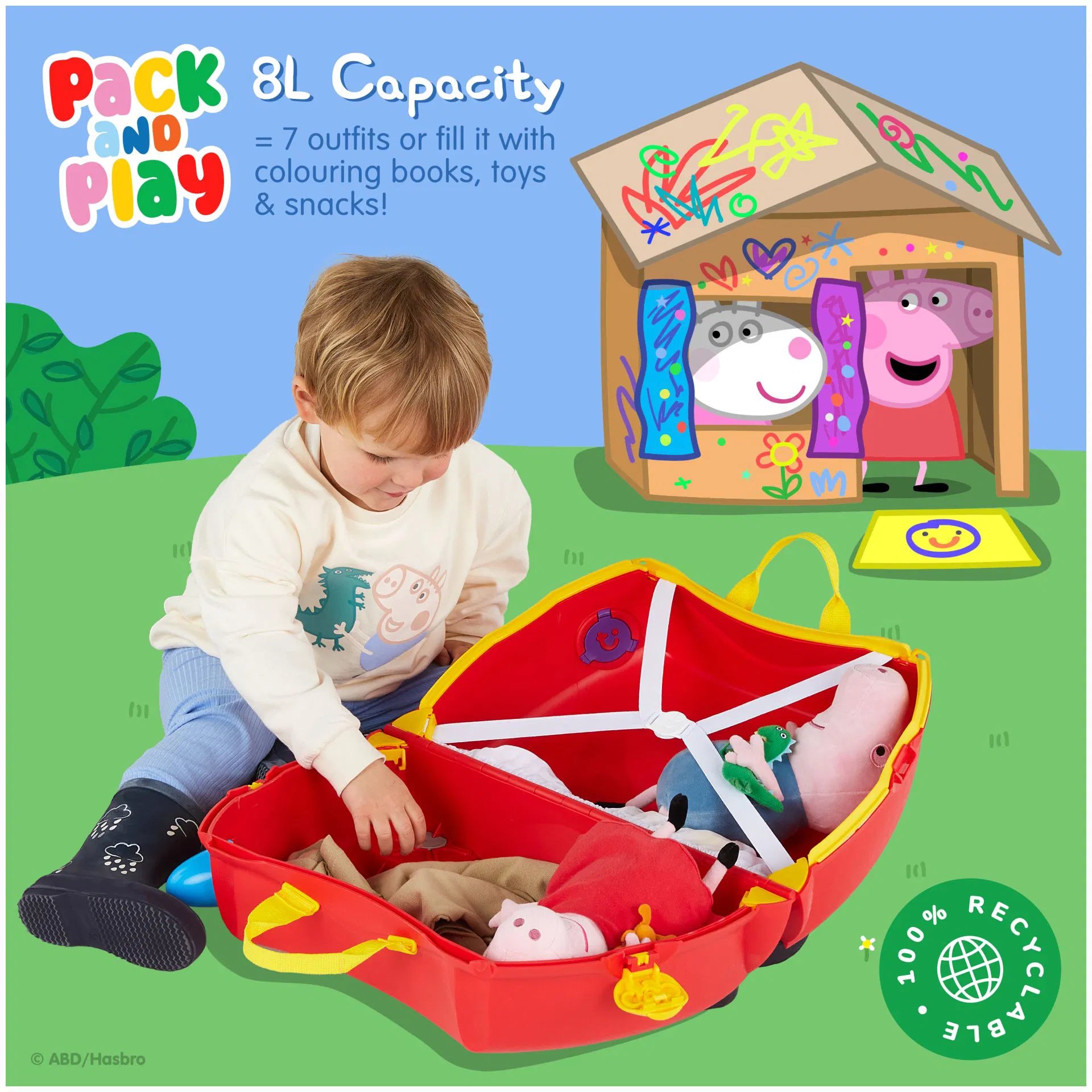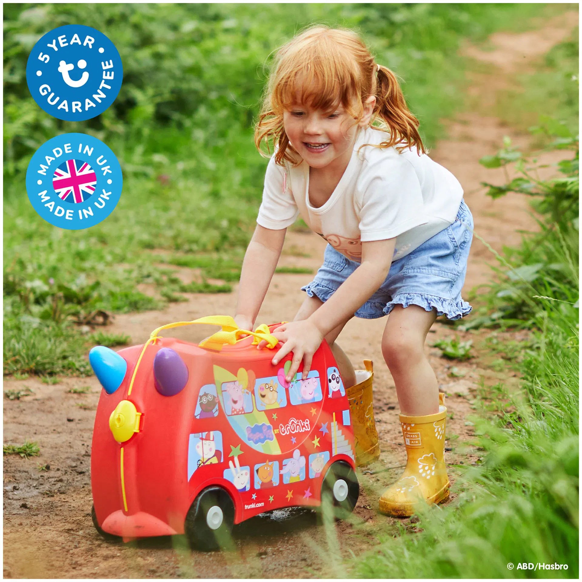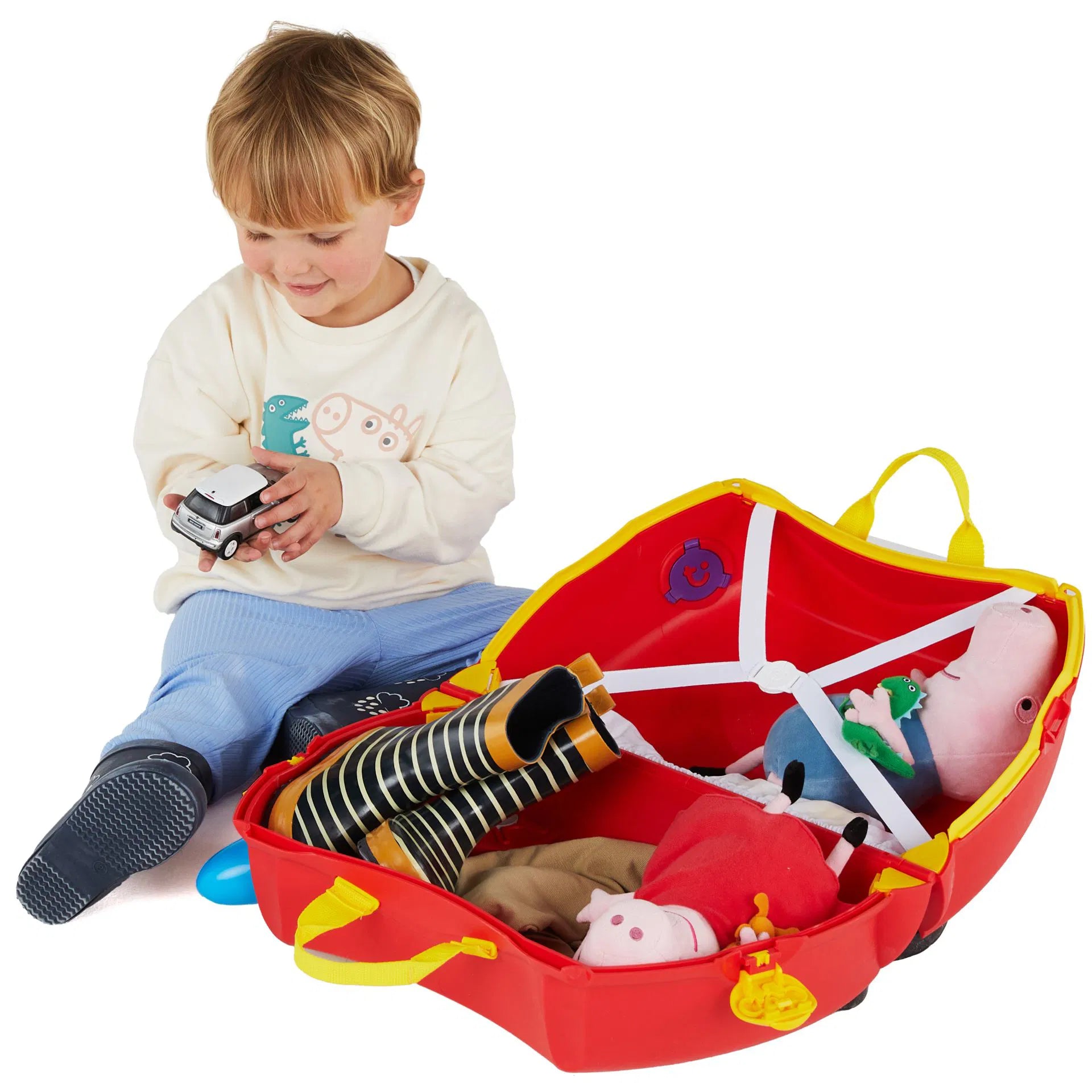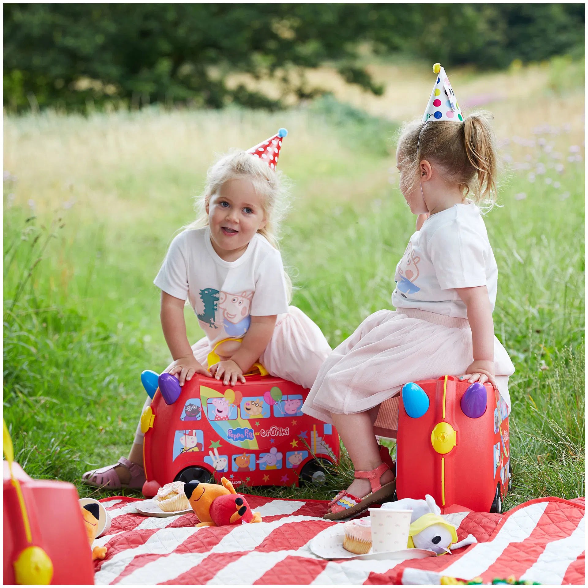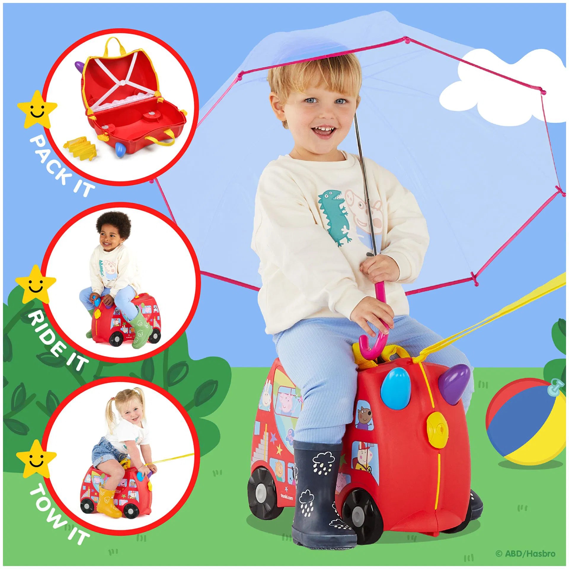 Hem bavul hem de çocukların yeni eğlence kaynağı. Çocuklarla seyahat artık daha kolay ve eğlenceli. Bavul olarak kullanılan Peppa Big Party Bus'ı çocuklar üzerine binerek sürebilir. İçinden çıkan askısı kullanılarak üzerine oturan çocukla birlikte yetişkinler tarafından çekilebilir. İhtiyaç duyulduğunda omuz askısı ile taşınabilir. Bavulun iki tarafında yer alan kilitler bavulun kolay ve sağlam bir şekilde kapanmasını sağlar. 18 litre iç hacmi vardır, boş ağılrlığı 1,7 kg'dır.